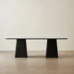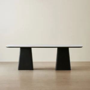 The base consists of two solid black wooden pedestals, each shaped with a wide stance. The table can comfortably accommodate eight to ten people, making it ideal for family dinners, celebrations, or hosting guests.