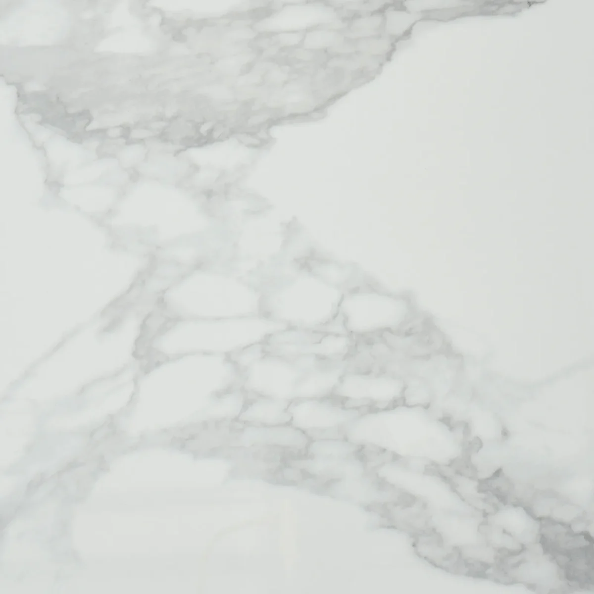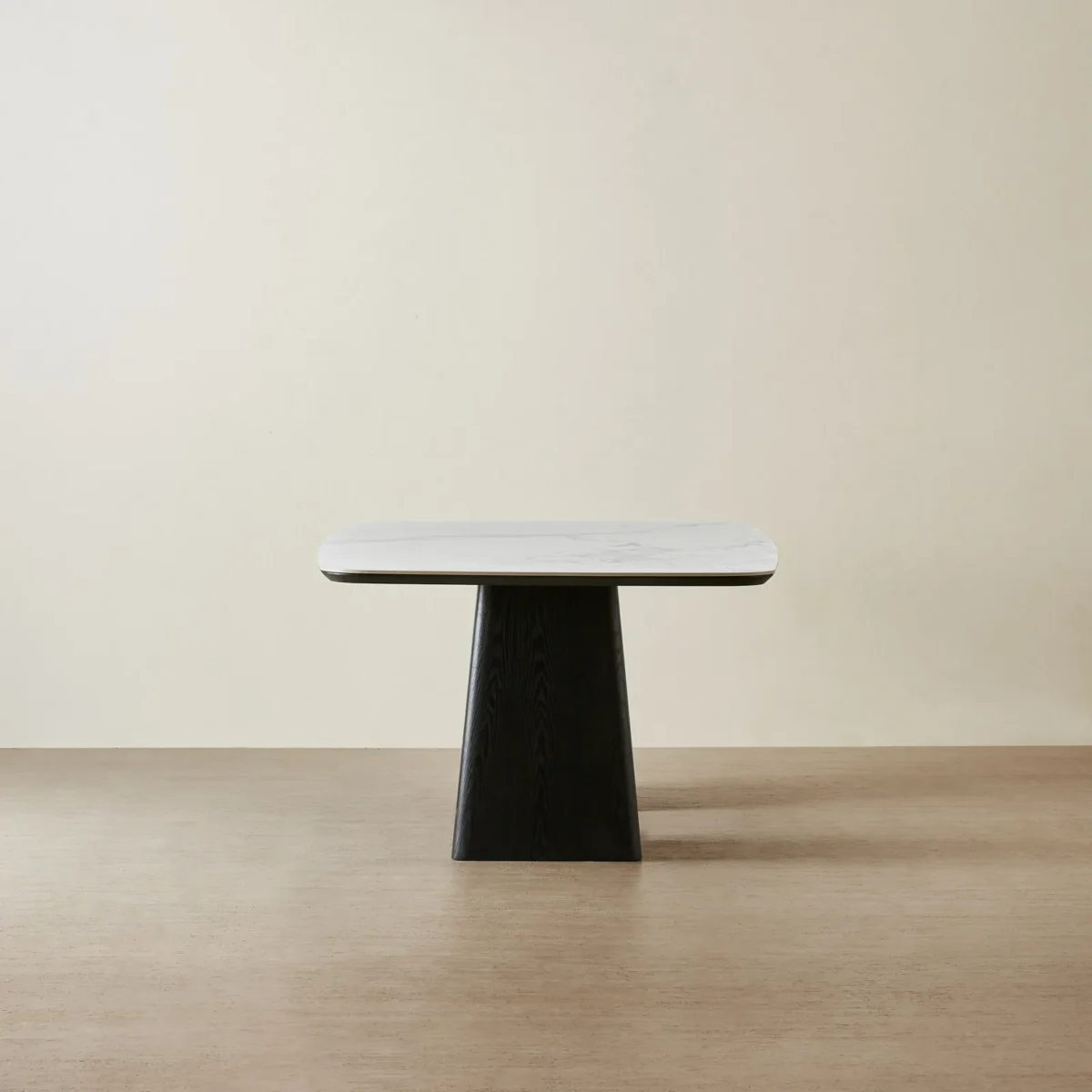 The Dunstan dining table features a smooth rectangular top made of statuario white sintered stone, offering a refined marble-like appearance.
