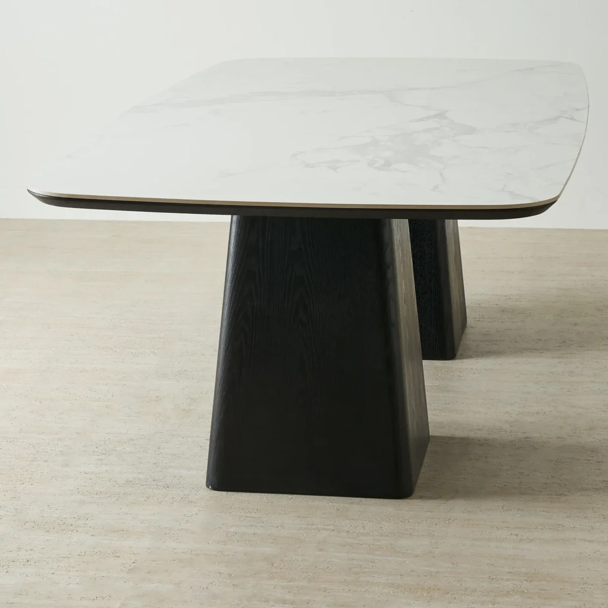 The base consists of two solid black wooden pedestals, each shaped with a wide stance. The table can comfortably accommodate eight to ten people, making it ideal for family dinners, celebrations, or hosting guests.