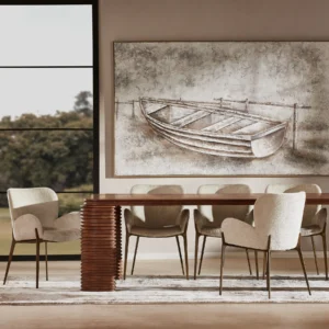 Gather around a table where design meets conversation. The Ophelia Dining Table captures attention with its mocha walnut veneer surface and thoughtfully curved edges.