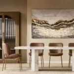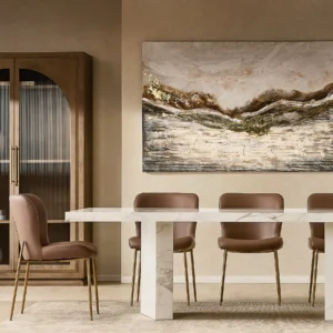 It comfortably seats eight to ten people, making it ideal for family meals or gatherings. It anchors the dining space, adding a sense of strength and refinement.
