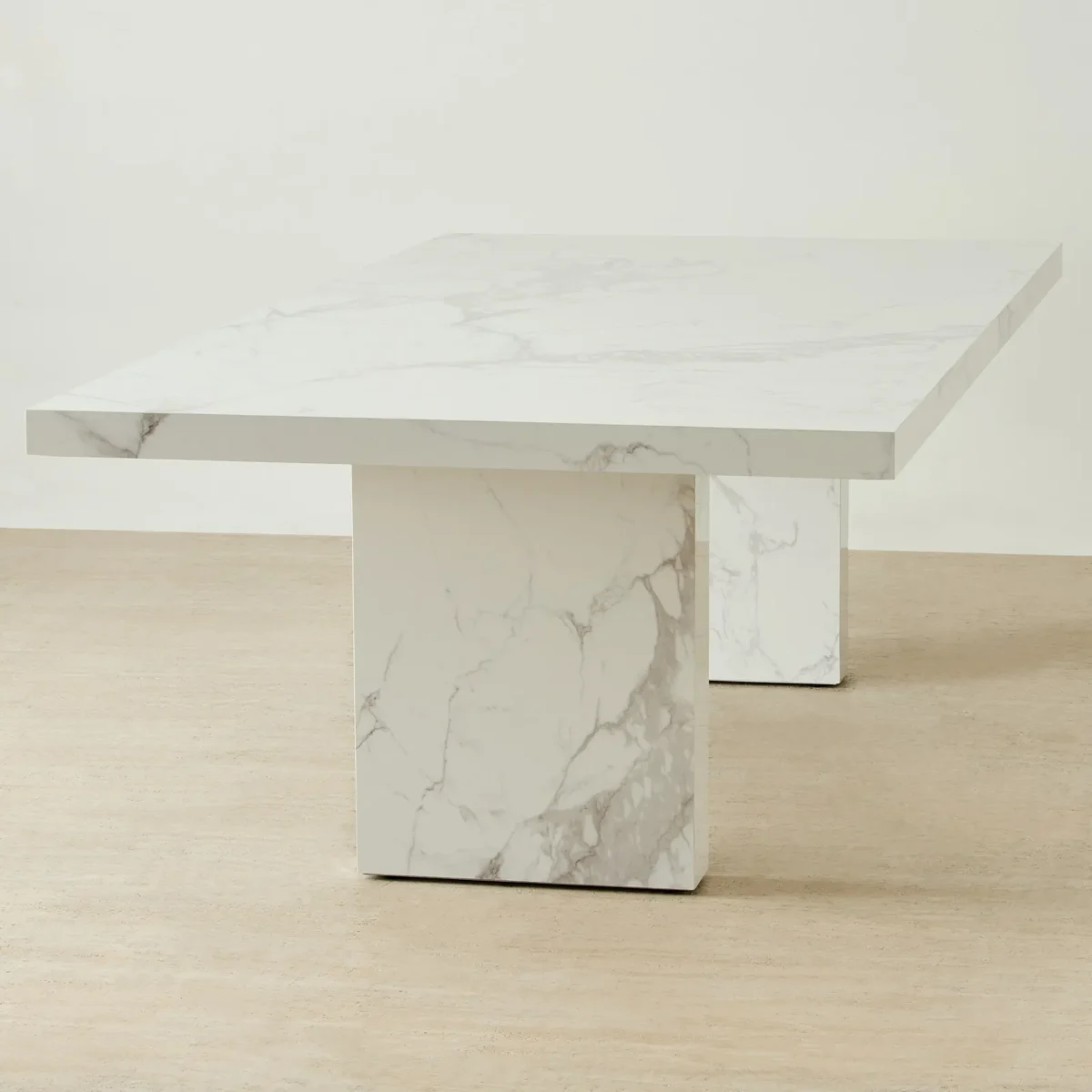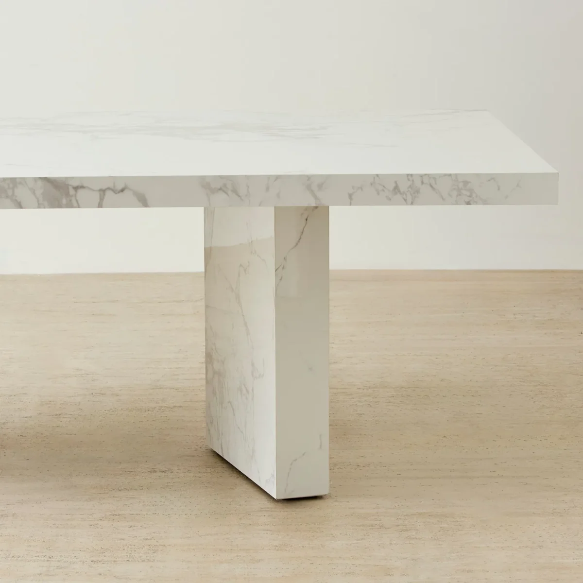 The Port Lucienne Dining Table has a striking monolithic presence with its bold slab design. Crafted from sintered stone, it offers the look of natural marble.