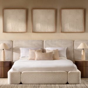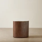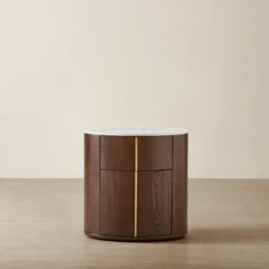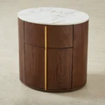 The Sir Lionell Bedside Table features a luxurious sintered stone top. Its round form adds visual softness while maximizing surface and storage space.