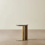 The Sir Lionell Gliding Side Table features a round white sintered stone top with gentle veining, set upon walnut brown wooden legs. The table’s design incorporates open spaces between the legs, creating a refined balance of form and function.