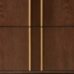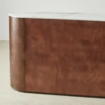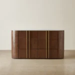 Vertical golden accents rise like elegant columns against the deep amber brown wood, creating a striking sense of balance and rhythm. Gently rounded corners and a grounded wooden base anchor the piece, making it as commanding as it is refined.