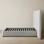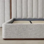 Draped in Murmur White woven fabric, it offers a soft, inviting texture. This combination gives the bed a modern aesthetic for contemporary bedrooms.