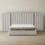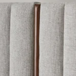 The Summerton Murmur White Fabric King Bed features a distinctive extended headboard with vertical tufting, providing a comfortable backrest.