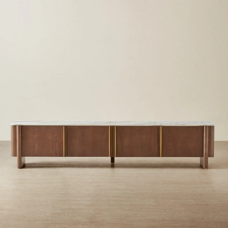 Sir Lionell Gliding White Sintered Stone Entertainment Unit – Walnut Brown Wooden Legs